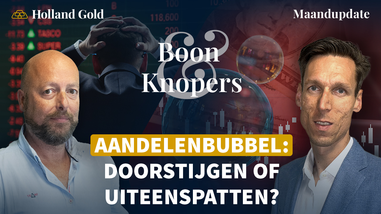 In deze maandupdate van Holland Gold bespreekt Yael Potjer met Frank Knopers een vraag die veel beleggers bezighoudt: zitten we in een bubbel op de aandelenmarkten? Als je kijkt naar de index als geheel lijkt dat inderdaad het geval, met recordkoersen en ook zeer hoge koers/winst verhoudingen. Maar volgens Frank Knopers hebben lage rentes en voortdurende geldontwaarding niet alleen aandelen, maar ook vastgoed, goud en Bitcoin naar recordhoogten gestuwd. Wie inzoomt op bepaalde sectoren, zoals AI, technologie en de wapenindustrie, kan wel tekenen van een bubbel zien. Maar voor de bredere aandelenmarkt is de hoge waardering een weerspiegeling van het lage rendement op spaargeld. Frank Knopers legt uit waar de risico’s liggen en waarom een bubbel niet altijd hoeft te barsten zolang centrale banken ruim beleid blijven voeren.
